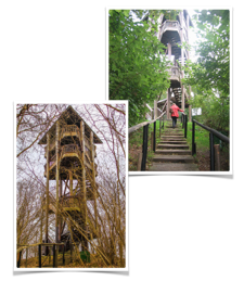Der 40 Meter hohe Aussichtsturm in der Mitte des Pfades erlaubt einen weiten Blick in die Rügener Landschaft. Auf einer Gesamthöhe von 82 Metern über dem Meeresspiegel zeigen sich bei guter Sicht sogar die Kirchturmspitzen von Stralsund und die Pylonen der Rügenbrücke. Mit ein wenig Glück lassen sich von dem Turm, der einem